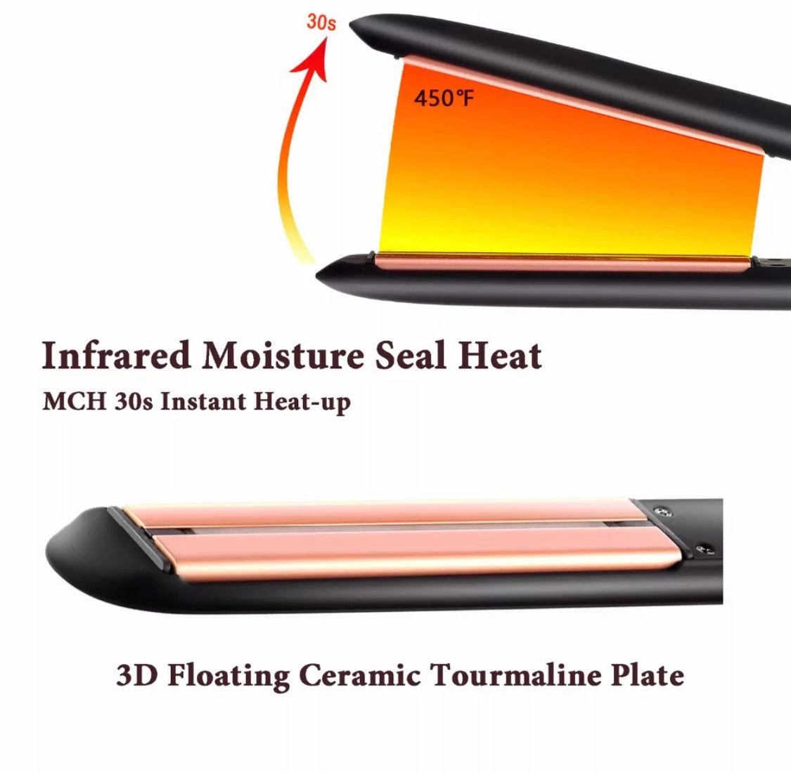 HFP Infrared Ionic Tourmaline Heat Protecting Flat Iron. The HFP Infrared Flat Iron produces negative ions and far infrared heat which eliminates frizz and adds shine while styling. Extra wide, 1” heat venting plates with a high gloss finish tourmaline ceramic, for effortless, perfectly smooth styling, on any type of hair. This tool will allow you to achieve faster results, lock in moisture and apply heat that is unbelievably kind to the hair shaft.